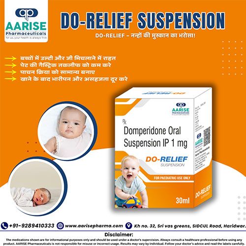 Do-Relief Suspension is best given half an hour before each meal. If given half an hour before each meal. If given after meals, it will still work but the absorption of the medicine may get affected. For young babies, the doctor may prescribe giving it four times each day. Wait for at least 4 hours between doses and give each dose just before milk feed. Do-Relief Suspension by Aarise Pharmaceuticals contains Domperidone Oral Suspension IP 1 mg, a trusted medicine for the relief of nausea, vomiting, bloating, and discomfort caused by delayed stomach emptying. It works by enhancing stomach and intestinal movement, ensuring faster digestion and improved comfort. Suitable for children as prescribed by a healthcare professional, Do-Relief Suspension offers effective gastrointestinal relief with high-quality manufacturing standards for safety and efficacy.